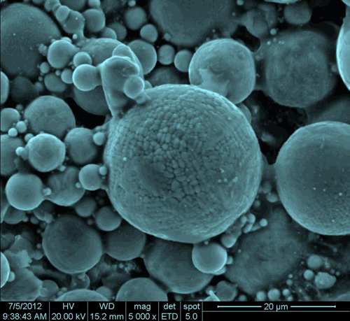 图片描述:本作品为45CrMoV轴疲劳断口的扫描观察,图中最大的球很像大米花球。