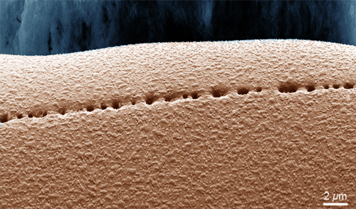 作者信息: 中科院金属研究所-阳华杰-“孤单的探索者” 图片描述:纳米晶奥氏体不锈钢中的一条微裂纹在经过热处理后出现了局部缩孔愈合的现象。这些微孔洞连接在一起就像雪山攀登者所留下的一串孤单而坚定的脚印。上方蓝黑色区域为样品台托盘与远处雪山的阴影面相对应。 实验方法:对经过严重塑性变形的纳米晶奥氏体不锈钢进行快速热处理,此图为扫描电镜观察表面形貌所得。 取样仪器名称型号:LEO-Supra55扫描电镜二次电子成像模式 图片处理软件名称:Photoshop CC加标尺并加色处理