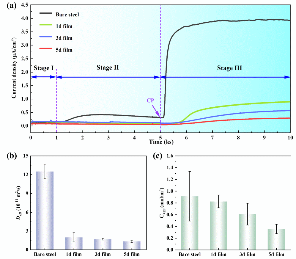 图2. 微生物腐蚀产物膜覆盖下 X80 钢的氢渗透行为:(a) 在 −1.1 V vs. SCE 阴极极化条件下的氢渗透电流密度–时间曲线;(b) 有效氢扩散系数(Deff);(c) 表观氢浓度(Capp)。