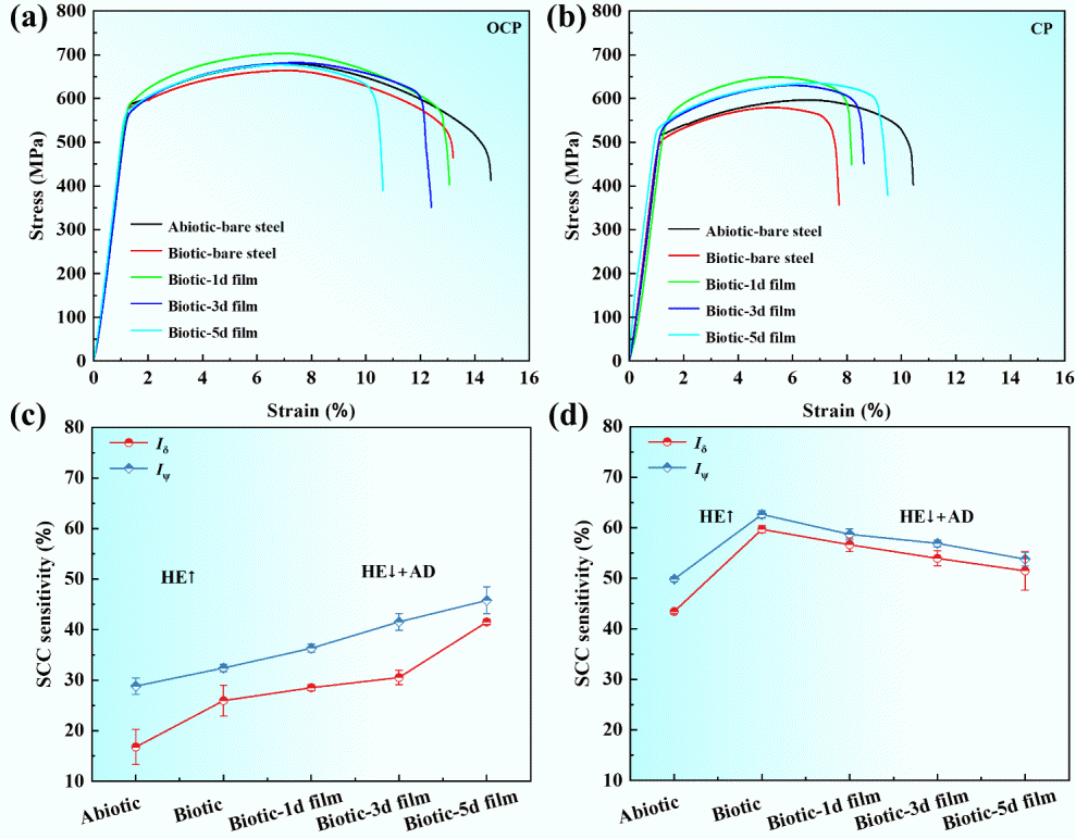 图3. 微生物腐蚀产物膜覆盖下 X80 钢的应力腐蚀开裂敏感性测试结果:(a, c) 无阴极保护(CP)条件下 X80 钢的应力–应变曲线及 SCC 敏感性;(b, d) 在 −1.1 V vs. SCE 阴极保护(CP)条件下 X80 钢的应力–应变曲线及 SCC 敏感性。