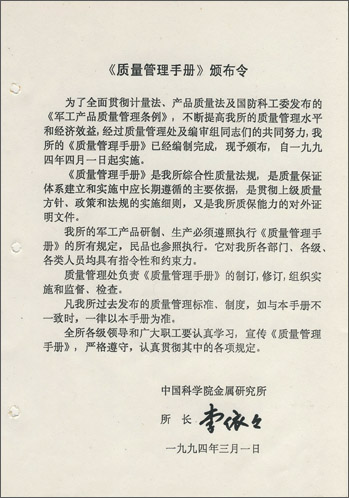 1993年3月我到质量管理处报到以后,首先认真地学习了相关质量管理体系文件,又到长春光机所和上海技物所等单位学习他们开展质量管理工作经验,参加了国家技术监督局和科学院组织的质量检验和质量监督岗位培训、标准化人员资格培训以及质量体系认证与ISO9000标准培训,取得了结业证书和资格证书。我深入到我所科研生产基层单位和有关管理部门了解情况,总结以前切实可行的成功经验,在此基础上编制完成了我所第一部质量管理手册,征求所领导和有关部门意见再进行修改,最后经主管科研生产的叶恒强副所长审定,李依依所长批准于1994年3月1日签发颁布令正式发布实施。手册包括《质量保证体系》、《研制和生产过程的质量控制》、《计量和测试的质量控制》、《外购器材和外协加工的质量控制》、《交付使用和技术服务》、《质量教育和考核》等六大部分,手册发布后在所内各有关部门培训和贯彻实施,为我所的质量管理和质量保证奠定了初步基础。