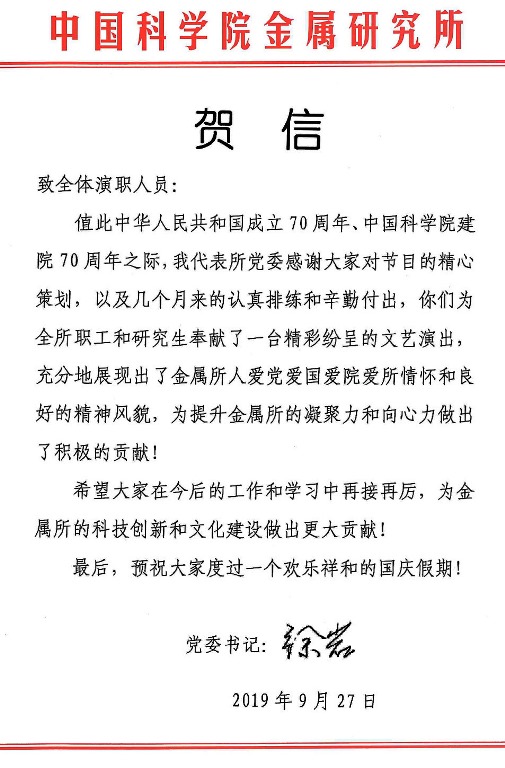 演出前,徐岩书记代表所党委和所班子致辞。他指出,新中国成立以来,中国共产党带领全国各族人民取得了举世瞩目的伟大成就,在新中国70华诞即将到来之际,我们欢聚在这里,以文艺演出的方式表达耀彩网人对中国共产党的无限热爱和对伟大祖国的美好祝福。他强调,金属研究所作为一个有着66年历史的老所、大所、强所,在老一辈科学家和几代人的不懈努力下,现已建设成为材料科学与工程领域国内一流并具有重要国际影响的研究机构,是我国高性能材料研究与发展的重要基地,为国家科技进步、经济社会发展和国家安全做出了一系列重要贡献,祖国科技事业的进步和发展有我们不可替代的贡献!徐岩书记激昂地说:走进新时代,欢歌颂盛世,祝愿伟大祖国更加繁荣昌盛、文明富强!