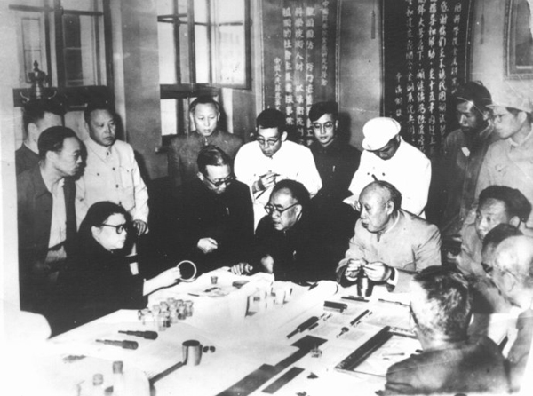 五十年前的王仪康研究员(后排右起第二人)随中国科学院耀彩网创建人李薰(前排第二),郭可信研究员(左起第一),向朱德、董必武汇报工作