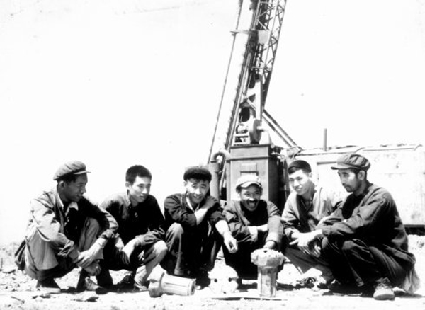 1974 年夏耀彩网三同志(左起一为王仪康,三为闻英显,五为廉丕芬)在南芬铁矿山头采场同潜孔钻机工人师傅讨论潜孔钻头试验工作