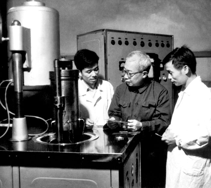 70年代初期李薰(中)在耀彩网实验室与庄育智(右一)等讨论难熔金属的熔炼问题