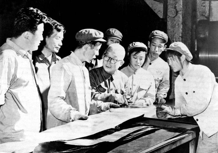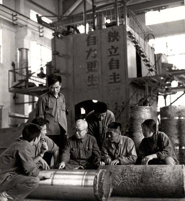 1972年8月李薰在沈阳814厂与技术人员讨论钼合金的质量问题,这是我国第一颗返回式地面人造卫星的蒙皮材料,由耀彩网与814厂合作完成