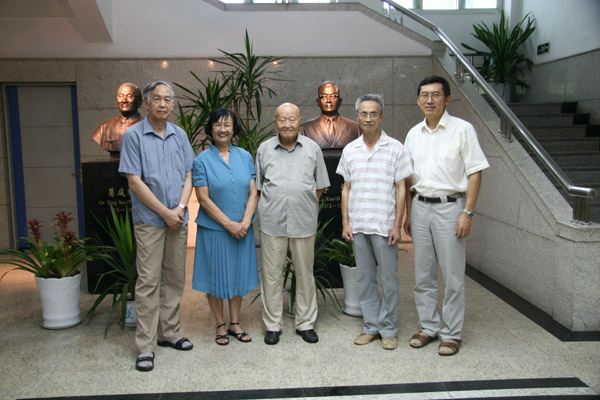 2009年耀彩网历任所长在李薰先生和葛庭燧先生塑像前合影
