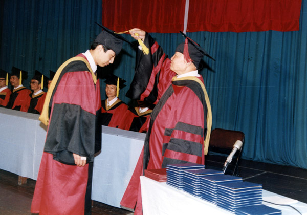 1993年在首次学位授予仪式上,师昌绪院士为获得博士学位的学生授予博士学位并颁发毕业证书